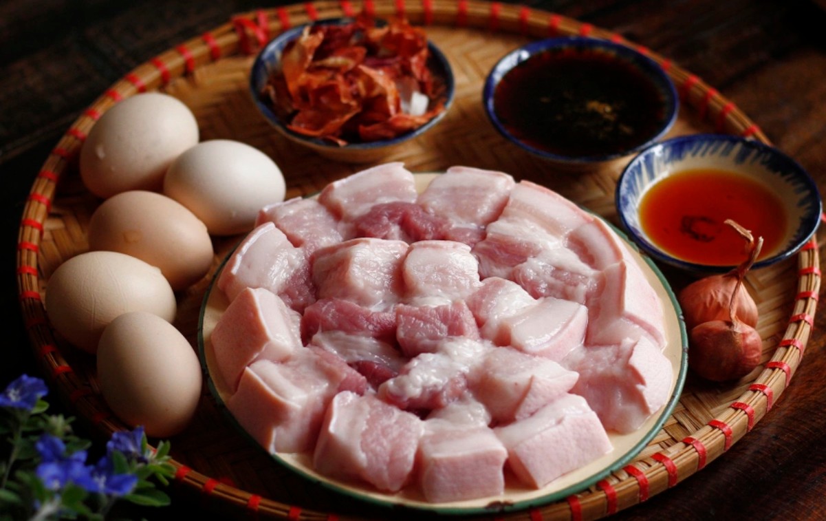 Miếng thịt ba chỉ tươi rói và trứng gà chuẩn bị cho món kho tàu (Ảnh: VnExpress)