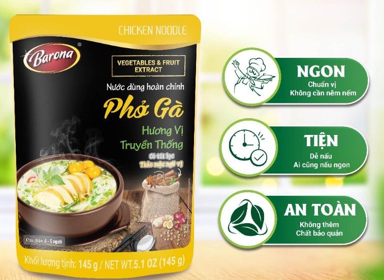 Điểm đặc biệt của sản phẩm là không cần nêm nếm thêm. Mỗi gói đã được nghiên cứu định lượng chuẩn vị, vừa giúp tiết kiệm thời gian, vừa giữ nguyên bản hương vị phở truyền thống. Hơn nữa, Barona cam kết không sử dụng chất bảo quản, an toàn cho sức khỏe cả gia đình.