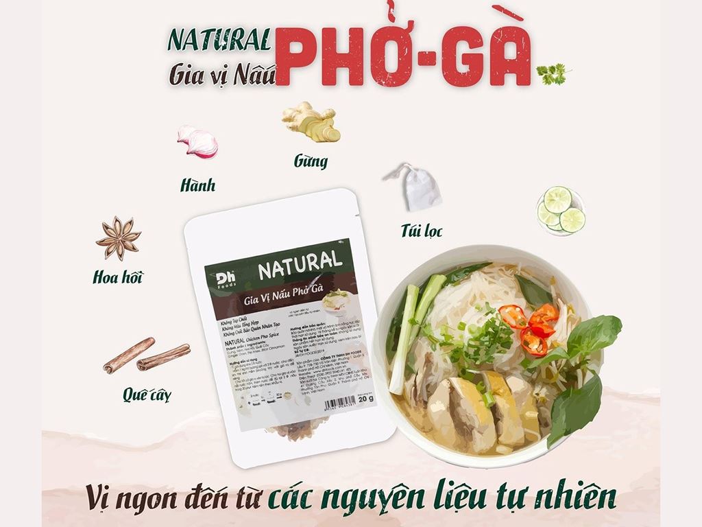 Gói gia vị được làm từ 100% nguyên liệu tự nhiên gồm gừng, hành, hoa hồi, quế cây. Nhờ đó, hương vị phở gà trở nên thanh ngọt, đậm đà và tốt cho sức khỏe. Chỉ với 1 gói 20g, bạn có thể nấu được 2 lít nước dùng, đủ cho một bữa ăn gia đình từ 4–5 người.