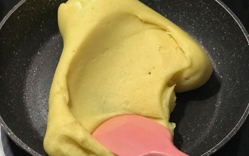 Khi nhân đã đạt độ khô vừa phải, bạn thêm bột nếp chín vào để tạo sự kết dính. Nhân đậu xanh khi nguội cần vo tròn dễ dàng, không dính tay, đó là dấu hiệu sên nhân thành công.