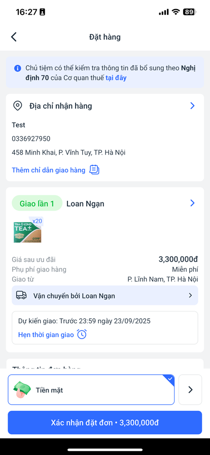 Bước 3: Khách Hàng rà soát lại các thông tin đặt hàng trước khi thanh toán. Khi Khách Hàng lựa chọn vào ô “Xác nhận đặt đơn” hoặc “Nhận mã giảm giá” (hoặc các giao diện tương tự) để xác nhận Đơn Đặt Hàng của mình có nghĩa là Khách Hàng xác nhận đã rà soát thông tin Đơn Đặt Hàng và đồng ý với các Điều khoản và điều kiện giao dịch của từng tính năng tương ứng khi mua Sản Phẩm trên Ứng Dụng. Việc Khách Hàng xác lập đơn hàng trên Ứng Dụng thành công được coi là Khách Hàng đã đưa ra đề nghị giao kết hợp đồng với Người Bán trên Ứng Dụng.